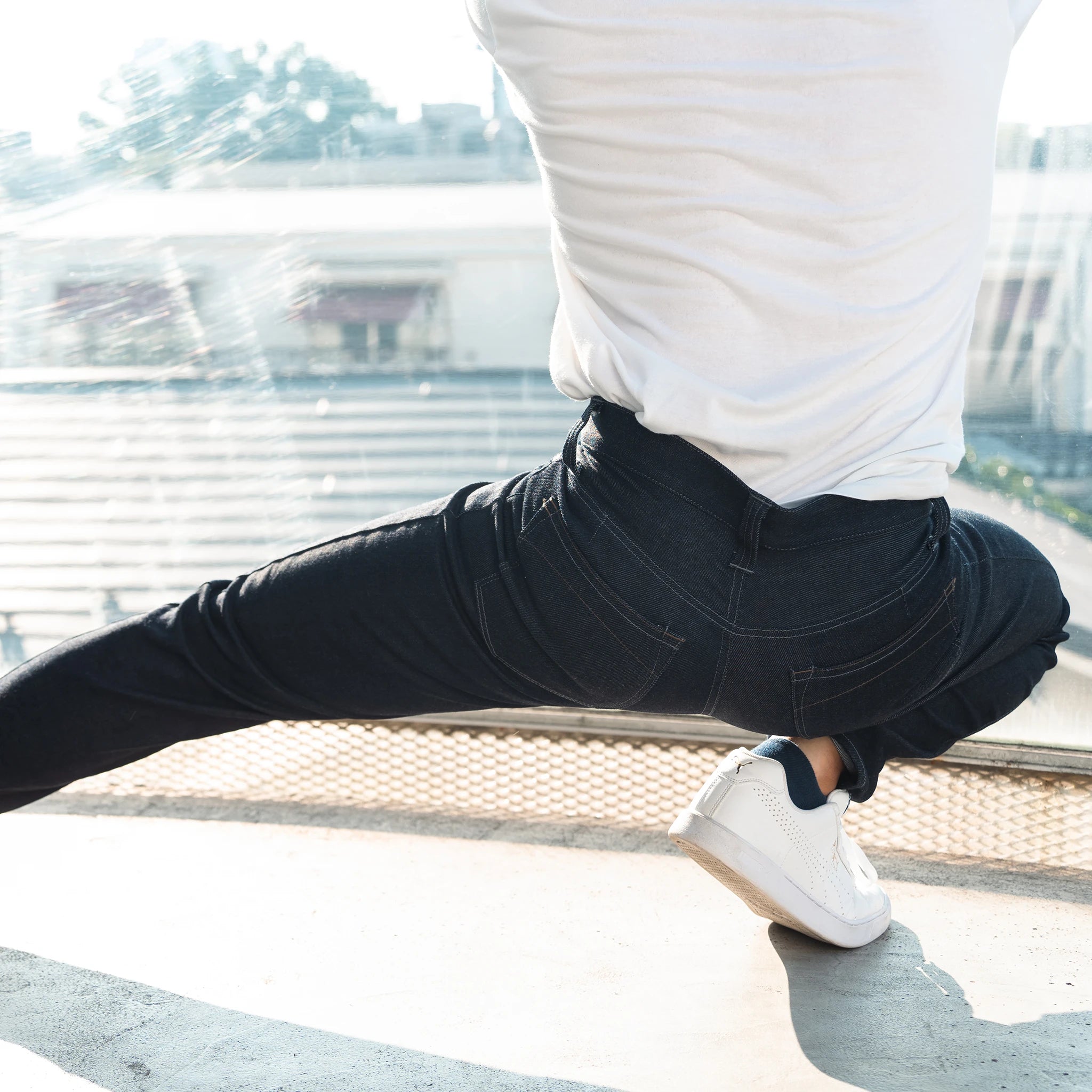 太ももはゆとりを持たせて、足元にかけてテーパード。鍛えられた下半身でもスッキリとスマートに見せます。