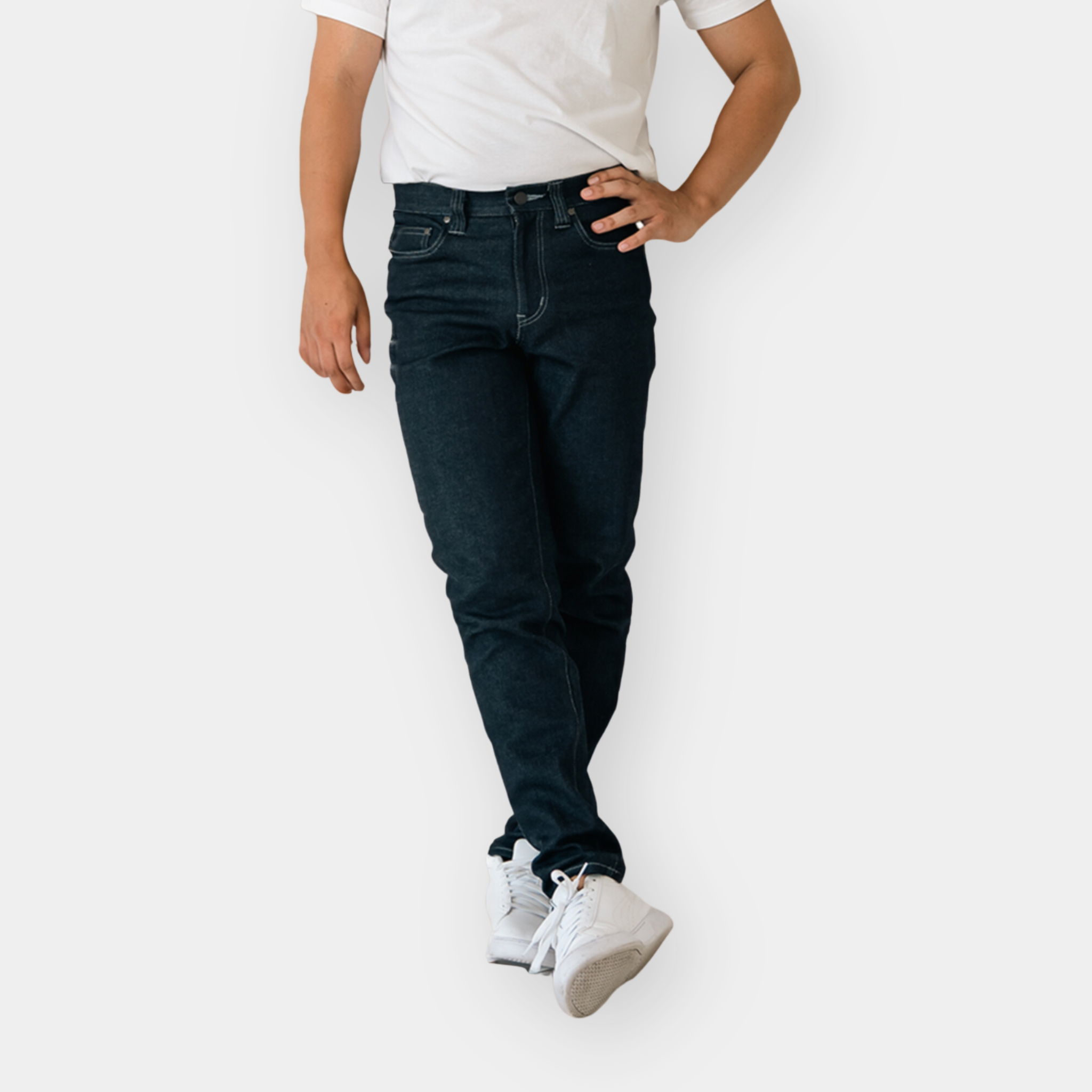 ガッチリ体型だけどスッキリ見せたい向けのジーンズ。太ももゆったりだけど、テーパードでスッキリした印象に。国産のストレッチデニムで快適な着用感。